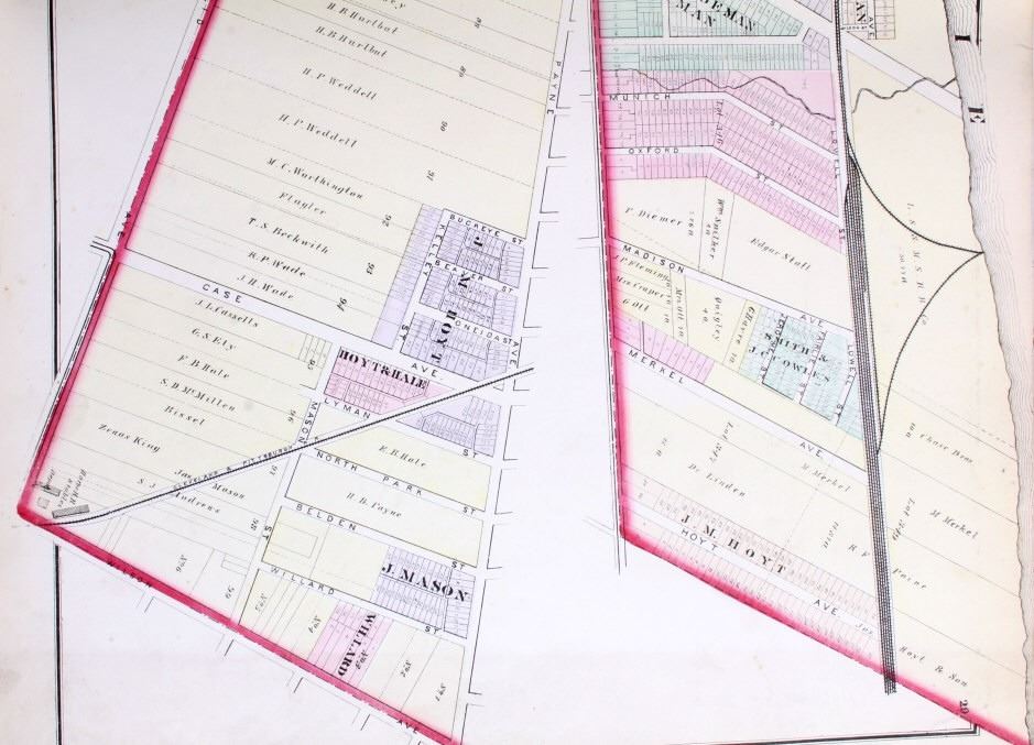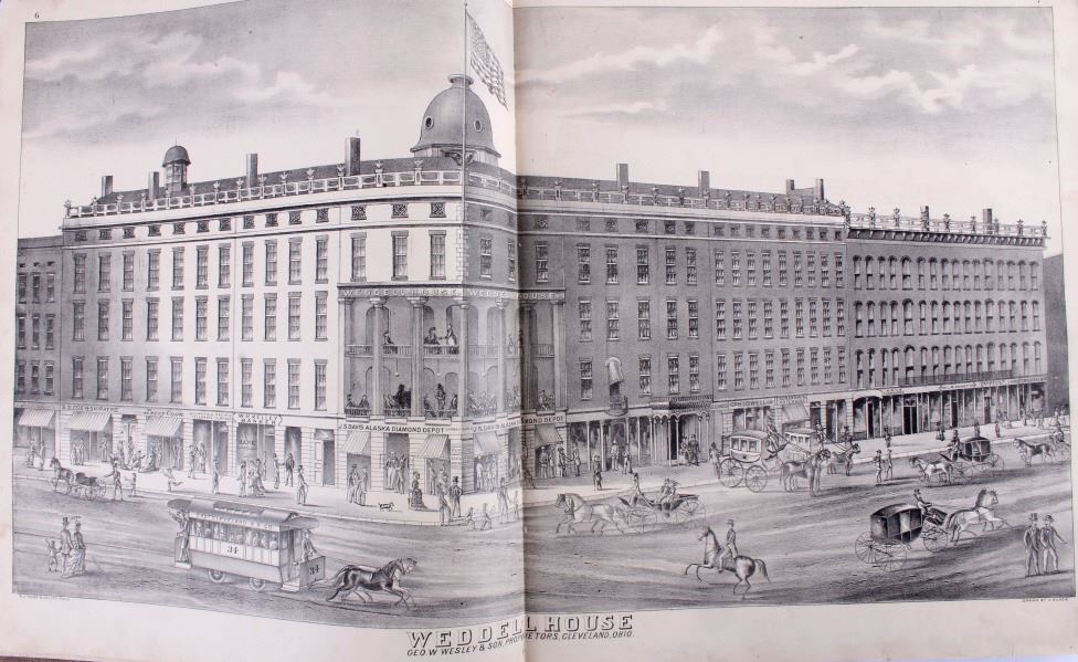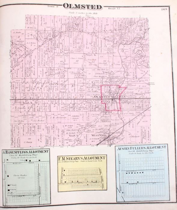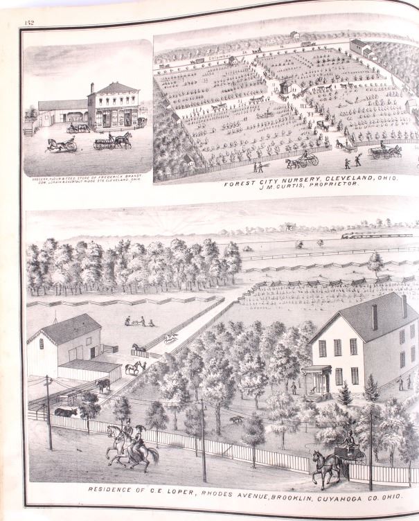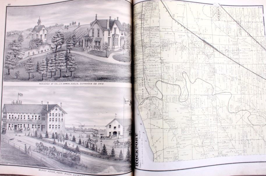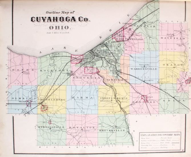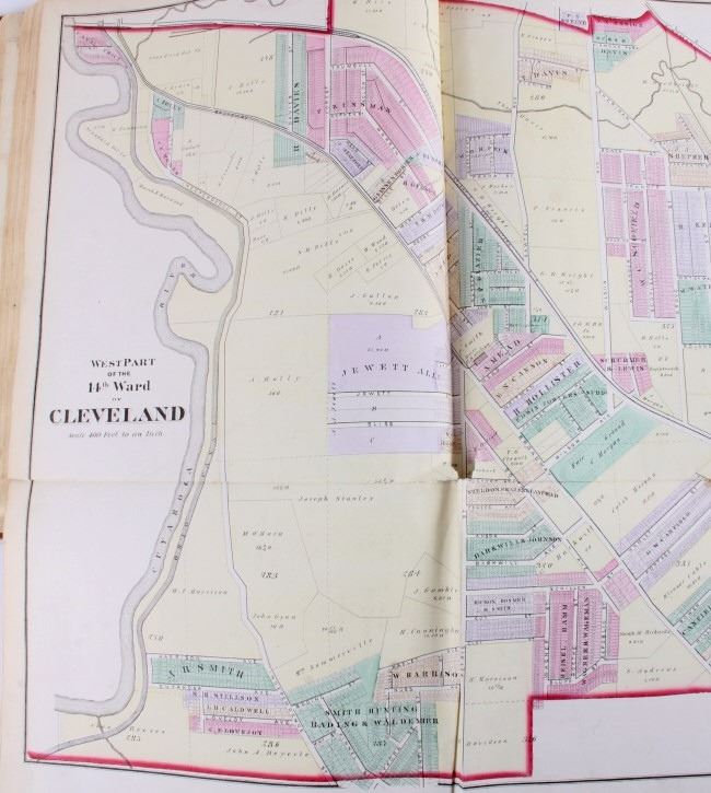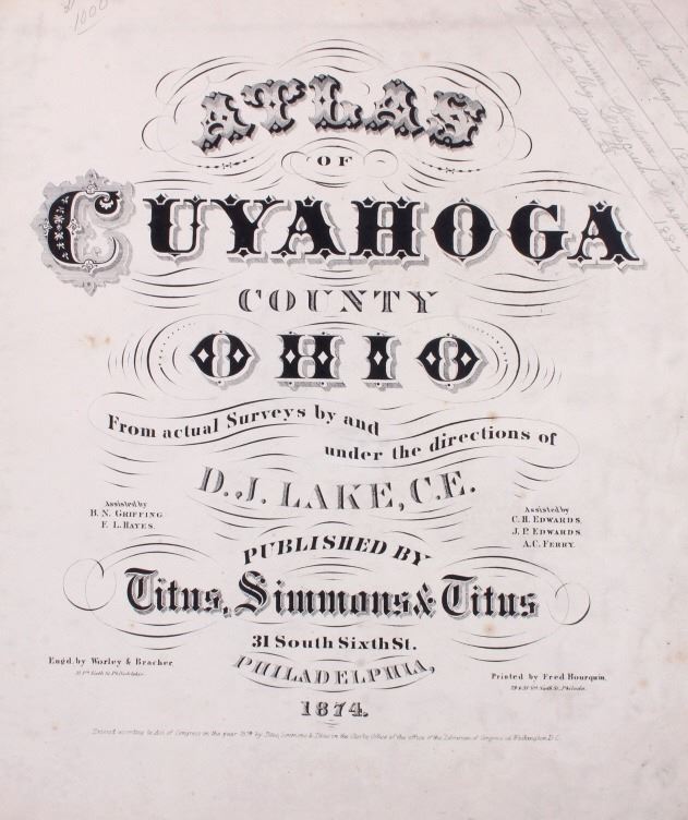 This is an 1874 atlas of Cuyahoga County, Ohio. The atlas was published by Titus, Simmons & Titus. The atlas features hand colored maps and lithographs throughout. The atlas shows good condition. It measures 14.5" x 16.5".
