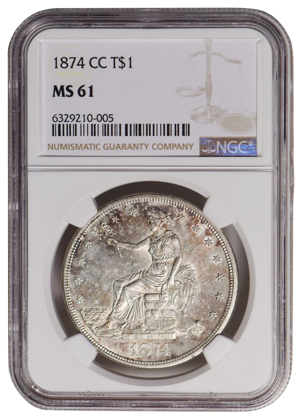 One 1874-CC $1 Trade Dollar NGC MS61.