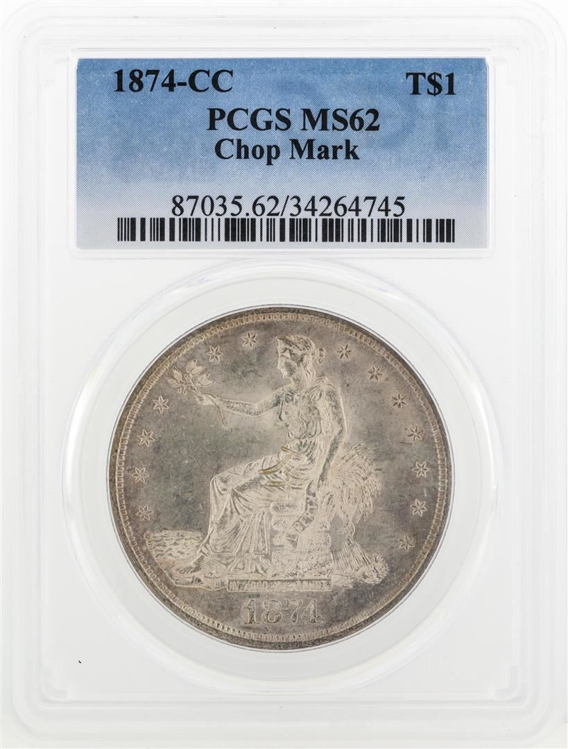 One 1874-CC $1 Trade Dollar Silver Coin PCGS MS62 Chop Mark. PCGS Graded.