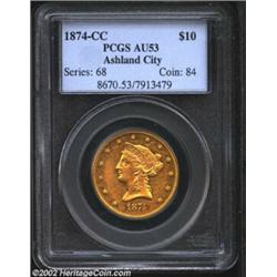 1874-CC $10 AU53 PCGS. Winter 1-A, the only known dies. Eagle production at the Carson City Mint ratcheted up to 16,767 pieces in 1874. This is a respectable total for the decade, and, indeed, the '74-CC is the most plentiful Carson City Eagle from the 1870s. A small hoard of 20-30 pieces entered the numismatic market in the mid-1990s. Most of these coins graded VF or XF, the two most prevalent grades among extant '74-CC Eagles. As a result, this issue remains elusive above the XF45 level with just 10-12 pieces believed extant in AU (per Winter and Halperin, 2001). This is a mostly lustrous survivor with ample remnants of a modest semi-prooflike finish. This is a curious feature, inasmuch as Winter states that most high grade examples are richly frosted in texture. Regardless, the already impressive eye appeal benefits even further from layers of green-gold and orange-gold colors. Moderately abraded with an identifying reverse scrape below the right scroll end. A similarly graded '74-CC Eagle sold for $10,350 as lot 1547 in Bowers and Merena's October 1999 sale of the Harry W. Bass, Jr. Collection. Although not the Bass example, the present coin is every bit its equal from a technical standpoint.From the Ashland City Collection. Important notice: We expect to be auctioning lots at the rate of 200-250 per hour. Sometimes eBay Premier live bid software cannot keep up with that pace, so we strongly recommend that you place a realistic proxy bid now as insurance to avoid disappointment. Also please note that all Heritage/CAA lots purchased through eBay Premier carry a 20% Buyer's Premium. Please make sure you read the Terms and Conditions.
