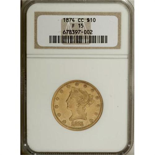 <B>1874-CC $10 Fine 15 NGC.</B></I> A dusky orange-gold example of this noted Carson City eagle issue, highly appealing despite significant wear. Minimally marked overall with several alloy dots to the right of the D in the denomination.<BR><BR><B>Coin Engraver:</B> Christian Gobrecht<BR><BR><b>Shipping:</b> Coins & Currency (<a target="_blank" href="http://www.heritageauctions.com/common/shipping.php">view shipping information</a>)