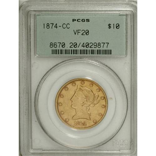 <B>1874-CC $10 VF20 PCGS.</B></I> Pleasing apricot-gold patination with red accents enriches both sides of this '74-CC specimen. All of the design elements show good definition, and the surfaces are quite clean for a coin that saw moderate circulation. This issue is scarce in XF and rare in AU and Uncirculated. Housed in a green-label holder.<BR><BR><b>Shipping:</b> Coins & Currency (<a target="_blank" href="http://www.heritageauctions.com/common/shipping.php">view shipping information</a>)