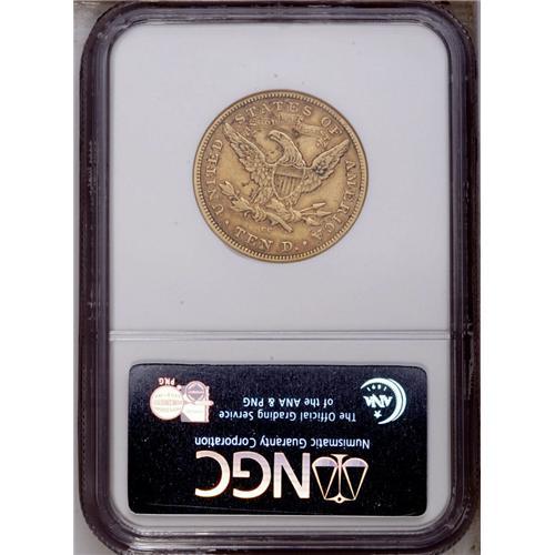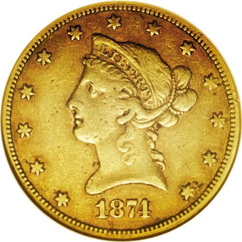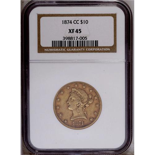 <B>1874-CC $10 XF45 NGC.</B></I> A circulated golden-brown representative with no significant marks. A few specks of dirt reside in selected recesses. The 1874-CC is the most available Carson City ten from its decade, but by any other standard, it is a rare issue. A scant 16,767 pieces were struck, and these circulated heavily, since NGC and PCGS have certified a combined two coins in Mint State.