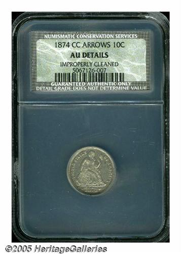 <B>1874-CC<10C> Arrows AU Details, Improperly Cleaned, NCS.</B></I> The 1874-CC is the key to the Seated dime series, excluding the non-collectible 1873-CC No Arrows. Only 10,817 pieces were struck, and it seems like a higher percentage than usual of the surviving examples show some sort of post-striking problem(s). Weakly struck, the surfaces on this piece are bright from cleaning. Additionally, the surfaces show a number of small to medium-sized marks, the most prominent being a scratch that runs parallel to Liberty's leg, a mark below the TE of UNITED, a spot on the right side of the base under Liberty, and an irregular planchet flaw in the bottom portion of the wreath. In spite of the problems listed above, this piece is bound to receive numerous, strong bids from collectors who need this rare issue to complete a set.<BR><I>From The Empire State Collection.</B></I>