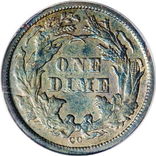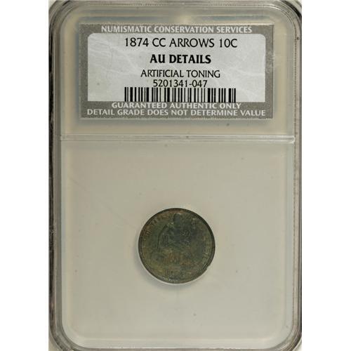 <B>1874-CC 10C Arrows--Artificial Toning--NCS. AU Details.</B></I> A mere 10,817 pieces were struck for this rare issue, a mintage 7,974 pieces fewer than the only other Carson City Arrows dime, the 1873-CC. This splendidly detailed survivor exhibits deep jade-green and peach toning. When viewed beneath a strong loupe, the surfaces appear mildly granular, and the obverse has a few hair-thin marks. The common Carson City issues (1875 to 1877) appear frequently at auction, even in Mint State, but the 1874-CC is a perpetual presence on the want lists of specialists, and examples with partial mint luster are extremely rare.<BR><BR><b>Shipping:</b> Coins & Currency (<a target="_blank" href="http://www.heritageauctions.com/common/shipping.php">view shipping information</a>)
