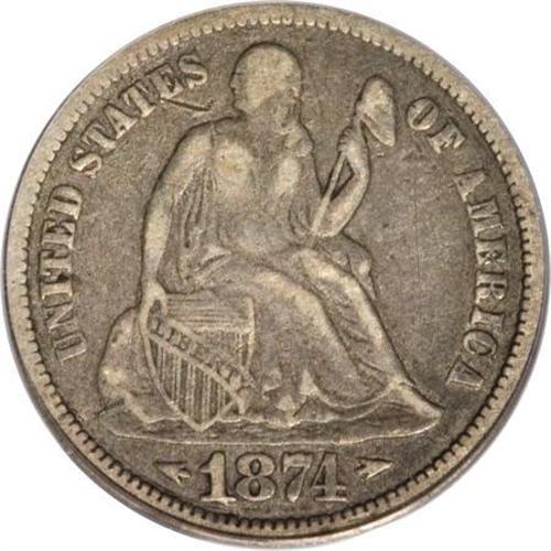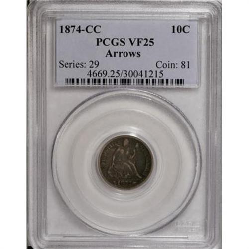 <B>1874-CC 10C Arrows VF25 PCGS.</B></I> The shift in weight for the minor silver coins that took place in 1873 had the most immediate impact at Carson City. The No Arrows dimes for that year were melted save for a single piece, and like the CC-mint issues of 1871 and 1872, the 1873-CC Arrows is a challenging and sought-after variety. Those three issues, however, seem available when compared to the 1874-CC, the most elusive Seated dime represented in multiple collections.<BR> This slate-gray and cloud-gray representative shows distinct evidence of wear, an unsurprising consequence of the dearth of small change in Nevada at the time. Subtle blue accents visit the fields as well. Though a mark appears to the left of Liberty's head and an abrasion is present on the middle left part of the wreath, the coin displays beautifully for the grade assigned and shows few flaws otherwise. A notable and eminently collectible representative of this highly elusive issue. Population: 3 in 25, 9 finer (12/07).<BR><BR><B>Coin Engraver:</B> Christian Gobrecht<BR><BR><b>Shipping:</b> Coins & Currency (<a target="_blank" href="http://www.heritageauctions.com/common/shipping.php">view shipping information</a>)