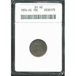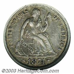 <TABLE cellSpacing=0 cellPadding=0 width="100%" bgColor=#000000 border=0><TBODY><TR><TD width="100%"><TABLE cellSpacing=1 cellPadding=3 width="100%" border=0><TBODY><TR><TD width="100%" bgColor=#79735c><FONT face=arial color=#ffffff size=3><B>Description</B> </FONT></TD></TR><TR><TD width="100%" bgColor=#ffffff><FONT face=arial size=2><B>1874-CC 10C Arrows XF45 ANACS.</B></I> The apple-green peripheries cede to rich dove-gray centers. A pleasingly detailed example, as only the left upright of the N in ONE is rendered indistinct due to the strike. All other design features are strong for the grade, especially the grains in the cereal wreath. Intense scrutiny reveals a nearly insignificant vertical abrasion above the E in DIME, which is mentioned primarily for pedigree purposes as it does not affect the eye appeal. One of only two CC-mint Arrows Dime issues, the 1874-CC may be the rarest business strike Seated Dime issue, if the unique 1873-CC No Arrows and the 1890-S Small S are regarded as varieties. Just 10,817 pieces were struck, which is the lowest Carson City mintage in the series. </FONT></TD></TR></TBODY></TABLE></TD></TR></TBODY></TABLE><BR><A name=PricesRealized></A><TABLE cellSpacing=0 cellPadding=0 width="100%" bgColor=#000000 border=0><TBODY><TR><TD width="100%"><TABLE cellSpacing=1 cellPadding=3 width="100%" border=0><TBODY><TR><TD width="100%" bgColor=#79735c><A name=PR><FONT face=arial color=#ffffff size=3><B>Previous Prices from Heritage Auctions</B> </FONT></A></TD></TR><TR><TD bgColor=#f6f6ed><TABLE cellSpacing=0 cellPadding=0 width="100%" border=1><TBODY><TR><TD align=middle width="33%"><B>Date</B></TD><TD align=middle width="33%"><B>Service</B></TD><TD align=middle width="33%"><B>Price</B></TD></TR><TR bgColor=whitesmoke><TD width="33%"><B>08/13/1999</B></TD><TD width="33%">PCGS</TD><TD width="33%">$18,400.00</TD></TR></TBODY></TABLE></TD></TR><TR><TD bgColor=#ffffff><FONT face=arial size=1 ?>PLEASE NOTE: All prices realized reflect the final hammer price PLUS the buyer's premium in auctions that charge a buyer's premium. Each item has a notation at the top of the listing indicating whether that lot included a buyer's premium. Example: A item that sells with a final hammer price of $100 and a 20% buyer's premium will display with a price realized of $120. All information listed is intended to be as accurate as possible, but errors are possible. Please use this guide carefully and inform us of any inaccuracies. </FONT></TD></TR></TBODY></TABLE></TD></TR></TBODY></TABLE><BR><TABLE cellSpacing=0 cellPadding=0 width="100%" bgColor=#000000 border=0><TBODY><TR><TD width="100%"><TABLE cellSpacing=1 cellPadding=3 width="100%" border=0><TBODY><TR><TD width="100%" bgColor=#79735c colSpan=6><FONT face=arial color=#ffffff size=3><B>Price Guide*</B> </FONT></TD></TR><TR bgColor=#f6f6ed><TD align=middle><B>Grade</B> </TD><TD align=middle><B>Coin World<BR>(Trends)</B> </TD><TD align=middle><B>Numismedia<BR>Retail</B> </TD><TD align=middle><B>Numismedia<BR>Wholesale</B> </TD><TD align=middle><B>Coin<BR>Universe</B> </TD><TD align=middle><B>Heritage<BR>Value Index</B> </TD></TR><TR bgColor=#ffffff><TD align=middle>40</TD><TD align=right>$18,500.00</TD><TD align=right>---</TD><TD align=right>$18,400.00</TD><TD align=right>$9,100.00</TD><TD align=right>$9,905.00</TD></TR><TR style="FONT-WEIGHT: bold" bgColor=#cccfdd><TD align=middle>45</TD><TD align=right>---</TD><TD align=right>---</TD><TD align=right>---</TD><TD align=right>---</TD><TD align=right>$14,623.75</TD></TR><TR bgColor=#ffffff><TD align=middle>50</TD><TD align=right>$24,500.00</TD><TD align=right>---</TD><TD align=right>$27,000.00</TD><TD align=right>---</TD><TD align=right>$21,283.33</TD></TR><TR bgColor=#ffffff><TD colSpan=6><FONT size=1>*All information listed is intended to be as accurate as possible, but errors are possible. No item may be returned or refused based on this information which is provided as a service to our customers. You should contact each pricing source directly to determine the accuracy of this information. </FONT></TD></TR></TBODY></TABLE></TD></TR></TBODY></TABLE><BR><TABLE cellSpacing=0 cellPadding=0 width="100%" bgColor=#000000 border=0><TBODY><TR><TD width="100%"><TABLE cellSpacing=1 cellPadding=3 width="100%" border=0><TBODY><TR><TD width="100%" bgColor=#79735c><FONT face=arial color=#ffffff size=3><B>Population Guide</B> </FONT></TD></TR><TR bgColor=#ffffff><TD align=middle><!-- Begin Output of Population Grid--><TABLE cellSpacing=0 cellPadding=0 width="100%" border=0><TBODY><TR><TD vAlign=center><TABLE cellSpacing=0 width="100%" border=1 cellsadding="3"><TBODY><TR><TD vAlign=center><TABLE cellSpacing=0 cellPadding=3 width="100%" border=1><TBODY><TR><TD vAlign=center align=middle bgColor=#f0f1e8 colSpan=2 <CENTER><FONT face=Arial size=2><B>PCGS Pop </B></FONT><CENTER></CENTER></TD><TD vAlign=center align=middle bgColor=#f0f1e8 colSpan=2><CENTER><FONT face=Arial size=2><B>NGC Pop</B></CENTER></FONT></TD></TR><TR><TD vAlign=center><FONT face=Arial size=2>(45)</FONT> </TD><TD vAlign=center align=right><FONT face=Arial size=2>1</FONT> </TD><TD vAlign=center><FONT face=Arial size=2>(45)</FONT> </TD><TD vAlign=center align=right><FONT face=Arial size=2>0</FONT> </TD></TR><TR><TD vAlign=center><FONT face=Arial size=2>(>45)</FONT> </TD><TD vAlign=center align=right><FONT face=Arial size=2>1</FONT> </TD><TD vAlign=center><FONT face=Arial size=2>(>45)</FONT> </TD><TD vAlign=center align=right><FONT face=Arial size=2>5</FONT> </TD></TR></TBODY></TABLE></TD></TR></TBODY></TABLE></TD></TR></TBODY></TABLE><!-- End Output of Population Grid--> Important notice: Heritage usually auctions material at the rate of 200-250 lots per hour. On some occasions eBay Live bid software or the Internet may not be able to keep up with the pace of the auction. We recommend placing a realistic absentee bid now as insurance to avoid disappointment. Occasionally the auctioneer may eliminate or reject an eBay Live bid, and the au