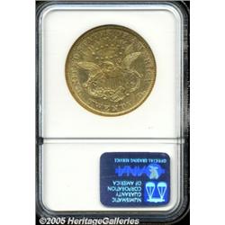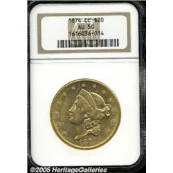 <B>1874-CC $20 AU50 NGC.</B></I> Considerable remaining luster bathes this reasonably struck Carson City piece. A couple of obverse bagmarks, however, the majority of the surfaces are attractive.