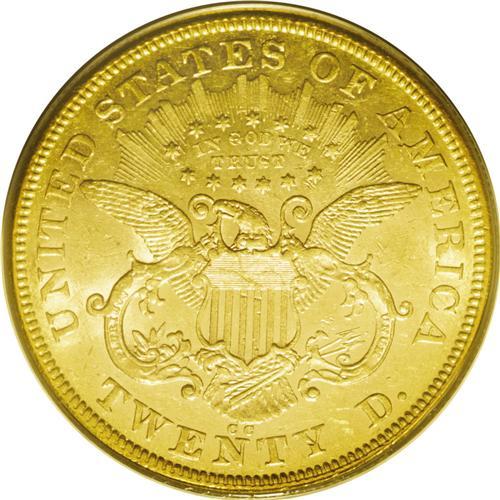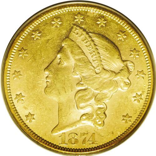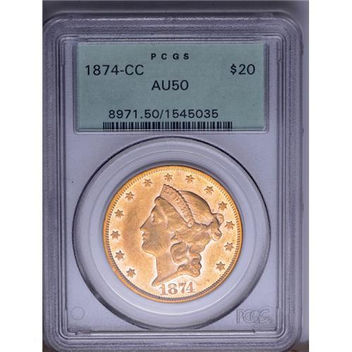 <B>1874-CC<$20> AU50 PCGS.</B></I> This is the first of the so-called "common date" Carson City Mint double eagles, with a production total of 115,085 coins, the first issue to reach the 100,000 coin mark. As the Mint increased production across the board, a new Superintendent was appointed. James Crawford was previously a member of the Nevada state legislature from 1866 to 1873, and he served his position at the Mint from 1874 until 1885, the longest tenure of any to hold that post, literally half of the Mint's entire life.<BR> No distinct die varieties have been reported for this date, although it seems likely that several different obverse and reverse dies were actually used. Although this coinage issue is usually available in circulated grades from VF to AU, these pieces are difficult to find with good eye appeal. This example is a brilliant yellow-gold example with wispy rose toning. The surfaces are lightly abraded, and retain considerable prooflike appearance. It is a highly appealing example housed in an older green-label holder.<BR><I>From The Wyoming Collection.</B></I>
