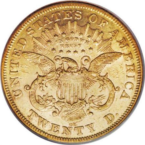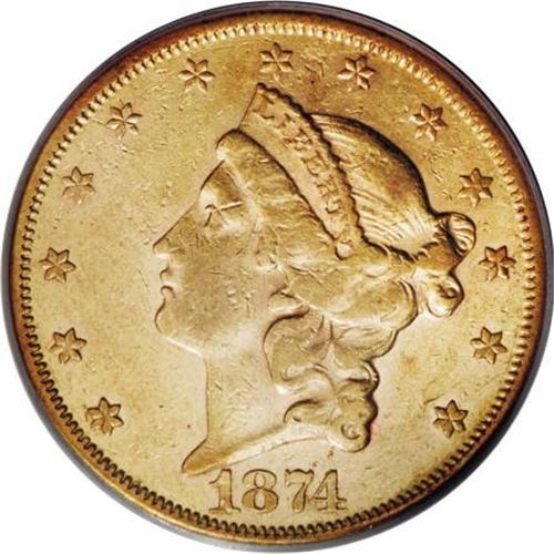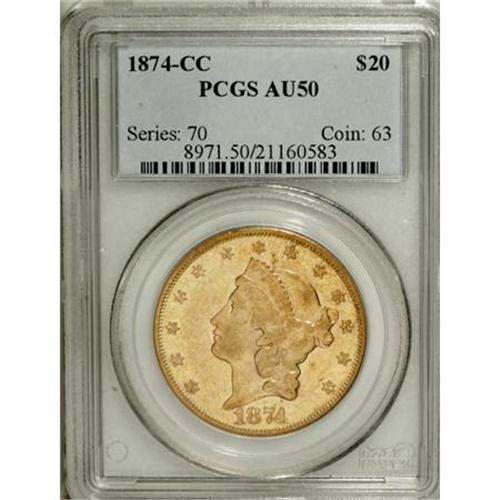 <B>1874-CC $20 AU50 PCGS.</B></I> Luster connects the reverse peripheral legends, and forms a halo around each obverse star. Moderate marks here and there are unimportant for the grade. Liberty's hair shows light wear, and the shield lines are incompletely brought up, but the eagle's wings are bold.<BR><BR><b>Shipping:</b> Coins & Currency (<a target="_blank" href="http://www.heritageauctions.com/common/shipping.php">view shipping information</a>)