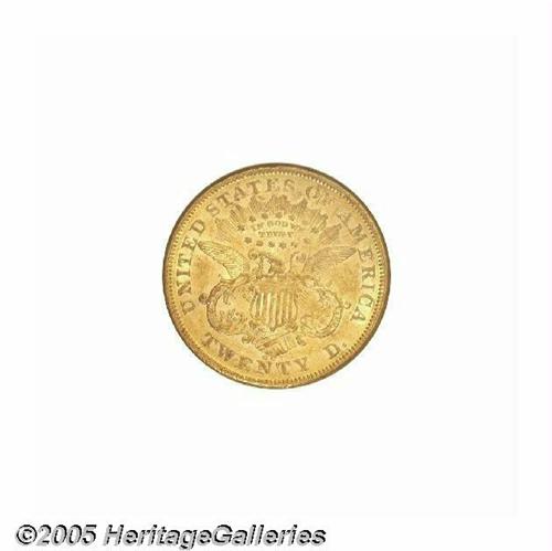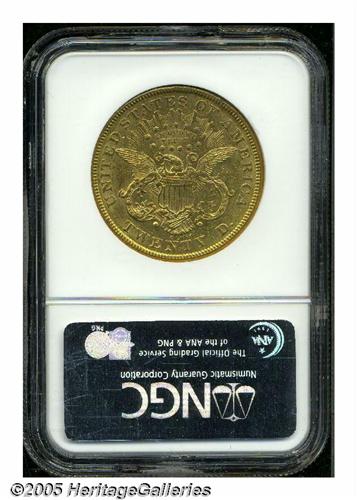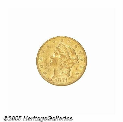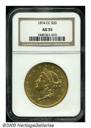 <B>1874-CC<$20> AU55 NGC.</B></I> Heavily abraded with some striking weakness and slight traces of luster in the protected areas. Some reddish patina has gathered over each side. An issue that appears fairly often in grades below AU55.