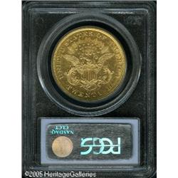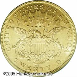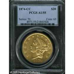 <B>1874-CC $20 AU55 PCGS.</B></I> Bright yellow-gold in color with some luster in the fields. The surfaces show some wispy lines from brief circulation, and the face and neck of Liberty are attractive for the grade. Well struck and pleasing for the grade. Lot:9086