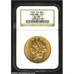1874-CC $20 AU58 NGC. Winter 1-A, the only known dies. The original mintage of the 1874-CC dwarfs that of the previous four Double Eagle deliveries from this coinage facility. In fact, the total of 115,085 pieces is the second highest in the Carson City Mint Double Eagle series. As one might expect, the '74-CC is a relatively common date, and survivors are more plentiful than those of all other CC-mint Twenties with the exception of the 1875-CC, 1876-CC, and 1890-CC. Far finer than the typically offered VF, XF, or low end AU survivor, this near-Mint representative retains plenty of original luster over medium intensity, yellow-gold features. There is a smattering of abrasions on both sides with a very shallow planchet flaw (as struck) in the obverse field at star 4. Well struck over all devices save for the obverse hair curls around Liberty's ear and the right (facing) shoulder of the reverse eagle.From the Ashland City Collection. Important notice: We expect to be auctioning lots at the rate of 200-250 per hour. Sometimes eBay Premier live bid software cannot keep up with that pace, so we strongly recommend that you place a realistic proxy bid now as insurance to avoid disappointment. Also please note that all Heritage/CAA lots purchased through eBay Premier carry a 20% Buyer's Premium. Please make sure you read the Terms and Conditions.