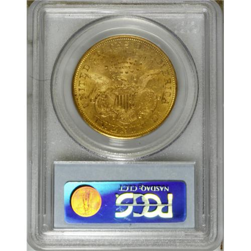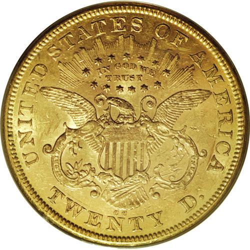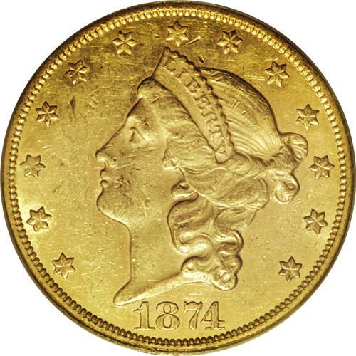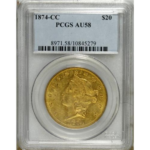 <B>1874-CC $20 AU58 PCGS.</B></I> For an early date among Carson City gold issues, this double eagle is surprisingly plentiful, although most known examples are noticeably worn. NGC and PCGS have only certified a couple dozen pieces in Mint State grades. This piece has reflective fields on the obverse with frosty luster on the reverse. Only a trace of wear can be seen on the highest design points. Population: 31 in 58, 10 finer (1/07).<BR><BR><b>Shipping:</b> Coins & Currency (<a target="_blank" href="http://www.heritageauctions.com/common/shipping.php">view shipping information</a>)