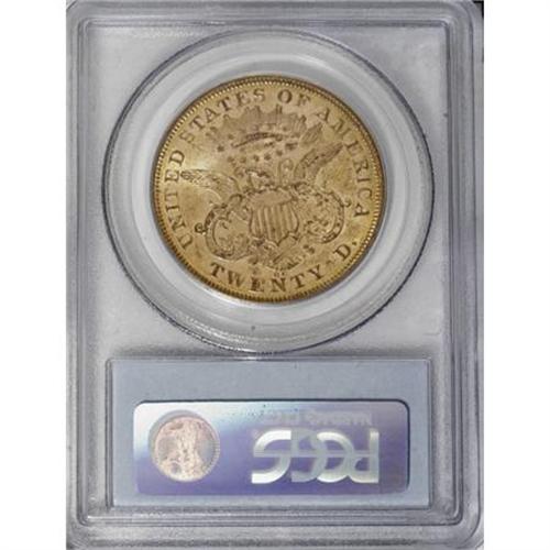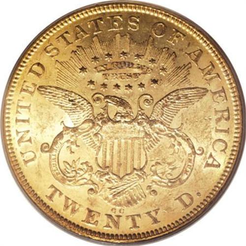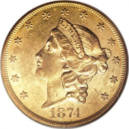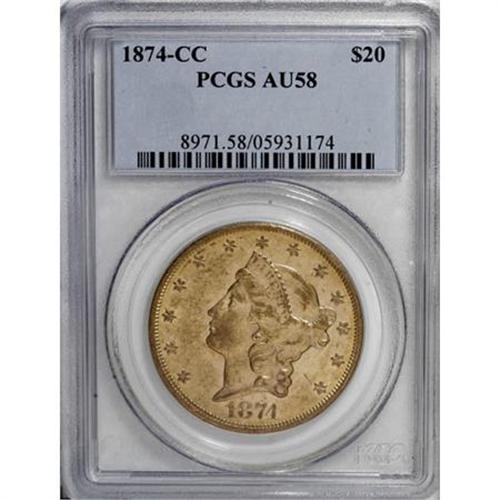 <B>1874-CC $20 AU58 PCGS.</B></I> Very close to a Mint State assessment, since the exposed fields display traces of the initial cartwheel sheen. This moderately bagmarked Carson City twenty is canary-gold throughout, except for a glimpse of sky-blue within IN GOD WE TRUST, which has minor mint-made laminations. Population: 33 in 58, 10 finer (6/07).<BR><BR><B>Coin Engraver:</B> James B. Longacre<BR><BR><b>Shipping:</b> Coins & Currency (<a target="_blank" href="http://www.heritageauctions.com/common/shipping.php">view shipping information</a>\)