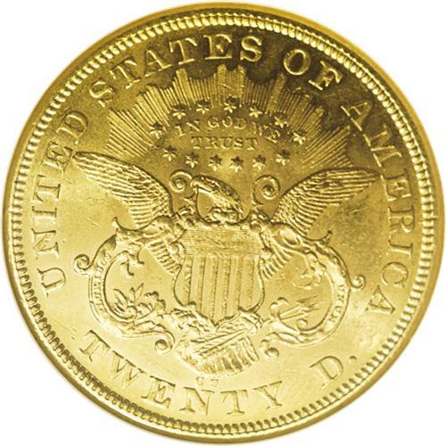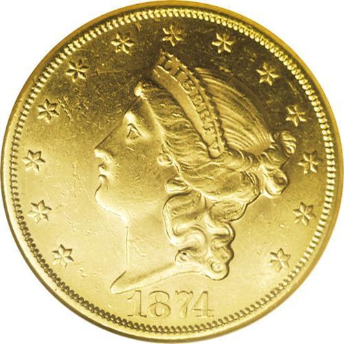 <B>1874-CC<$20>--Cleaned--ANACS. MS60 Details.</B></I> This is an especially attractive example with reflective fields and brilliant greenish-gold luster. There is little evidence of actual cleaning, aside from faint hairlines on each side.