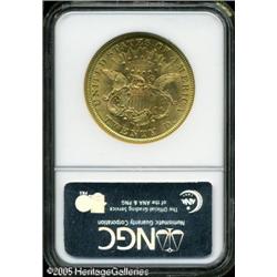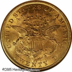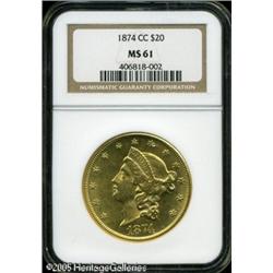 <B>1874-CC $20 MS61 NGC.</B></I> Both sides of this elusive Mint State example show less than the expected severity of surface marks, being satiny in texture with typically sharp definition overall. A diagonal facial blemish is more noticeable because of its prominent location than its size or depth. The 1874-CC enjoys great popularity in all grades and collectors can expect to locate an XF or even a low-end AU without too much difficulty. Uncirculated examples, however, are an entirely different matter altogether as perhaps less than 20 pieces are believed to survive. Population: 4 in 61, 1 finer (1/05). Lot:9087