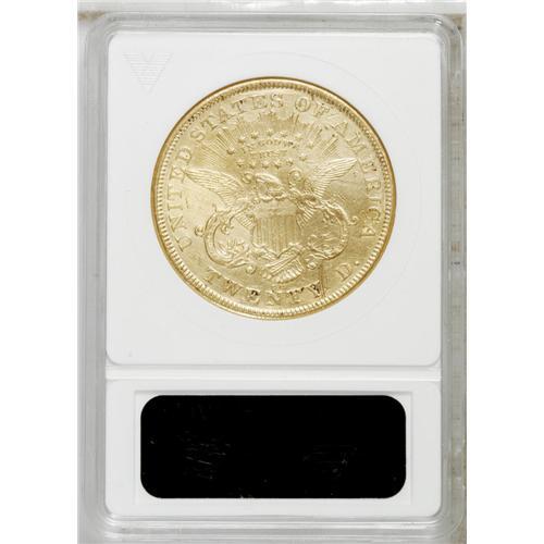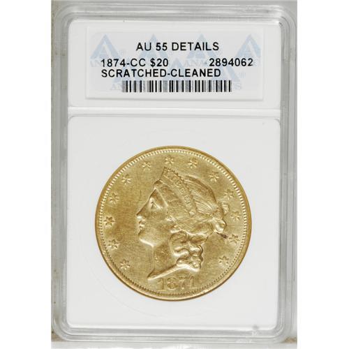 <B>1874-CC<$20>--Scratched, Cleaned--ANACS. AU55 Details.</B></I> This significant Carson City double eagle has suffered some misfortunes, including cleaning that has altered the luster of the yellow-orange surfaces and long scratches in the right reverse field. Large copper spots appear on each side.