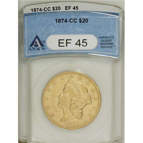 <B>1874-CC $20 XF45 ANACS.</B></I> A lightly worn Choice XF piece that has traces of original luster on each side. Softly struck with a number of marks on the wheat-gold surfaces.<BR><BR><b>Shipping:</b> Coin/Currency (<a target="_blank" href="http://www.heritageauctions.com/common/shipping.php">view shipping information</a>)