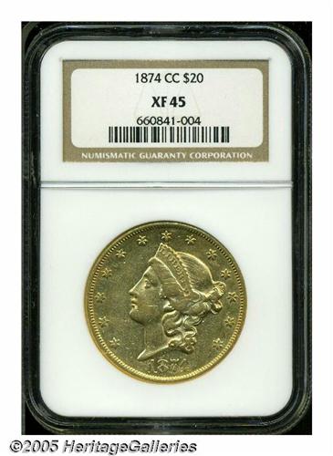 <B>1874-CC<$20> XF45 NGC.</B></I> Pleasing lightly circulated example of this Carson City issue. The surfaces are typically abraded with a few notable contact marks on the devices. None-the-less, a reasonably appealing example.
