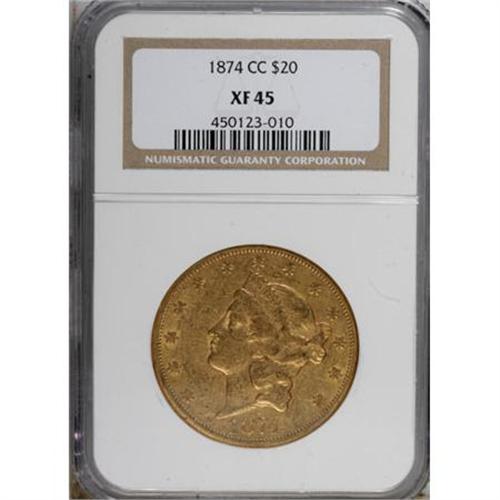 <B>1874-CC $20 XF45 NGC.</B></I> Honey-gold color bathes both sides of this Carson City issue. Generally well defined, and with the normal scattering of small circulation marks.<BR><BR><B>Coin Engraver:</B> James B. Longacre<BR><BR><b>Shipping:</b> Coins & Currency (<a target="_blank" href="http://www.heritageauctions.com/common/shipping.php">view shipping information</a>)