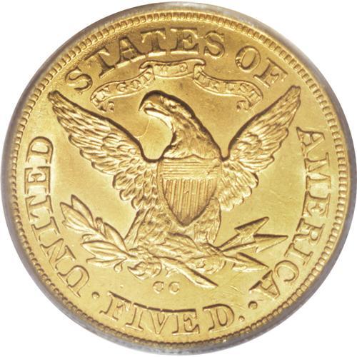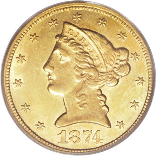 <B>1874-CC $5 AU58 PCGS.</B></I> Gold experts Jeff Garrett and Ron Guth note that "The 1874-CC is one of the more commonly available early-issue half eagles from the Carson City Mint. Quite a few examples have been offered at auction in the last 15 years, most in the Extremely Fine to About Uncirculated range." Of the 21,198 pieces struck, NGC and PCGS combined have certified only two Mint State pieces, both MS62 PCGS (4/07). A specialist seeking a Mint State example may never see one offered. PCGS has graded only eight pieces in AU58. The present specimen is only the third AU58 piece that we have offered in the past six years. This is a sharply struck tan-gold example with no mentionable impairments, save for a single scrape on Liberty's cheek near the hairline. Most of the luster is intact under minor field chatter, and the eye appeal is significant. An old clash mark is noted on the reverse. Population: 7 in 58, 2 finer (4/07).<BR><BR><b>Shipping:</b> Coins & Currency (<a target="_blank" href="http://www.heritageauctions.com/common/shipping.php">view shipping information</a>)