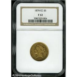 1874-CC $5 Fine 12 NGC. Liberty's hair curls and t <B>1874-CC $5 Fine 12 NGC.</B></I> Liberty's hair curls and the reverse plumage are well worn, and the tan-gold fields are not unduly abraded. The Carson City Mint's production of Half Eagles amounted to only 21,198 pieces in 1874. <BR><BR><B>Important notice:</B> Heritage usually auctions material at the rate of 200-250 lots per hour. On some occasions eBay Live bid software or the Internet may not be able to keep up with the pace of the auction. We recommend placing a realistic absentee bid now as insurance to avoid disappointment. Occasionally the auctioneer may eliminate or reject an eBay Live bid, and the auctioneer may also reopen a lot after the close of the eBay live bidding (usually because we missed an audience bid), and may reject your bid even if it shows you as the winning bidder. By bidding via eBay Live, you agree that Heritage may award the lot to another bidder at its sole discretion under the circumstances described above or any other reasonable circumstances. Since eBay bids are not shown to us until we open the lot on the floor, we treat those bids just like floor bids. In most cases the floor responds before the eBay bid is presented to us, due to Internet lag time, so for consistency we have made it a policy that floor bids are always considered first over tie eBay live bids. Also please note that all Heritage lots purchased through eBay Live carry a 20% Buyer's Premium. Please make sure you read the Terms and Conditions before you bid. This lot is being auctioned in conjunction with a live floor auction by Heritage Galleries & Auctioneers. All final auction and invoice information will be supplied by Heritage Galleries & Auctioneers, and all other information should be considered preliminary. Lot:6658