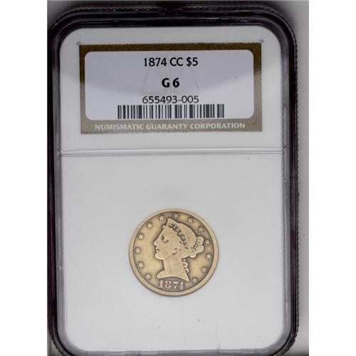 1874-CC $5 Good 6 NGC. A little over 21,000 pieces wer 1874-CC[$5] Good 6 NGC.