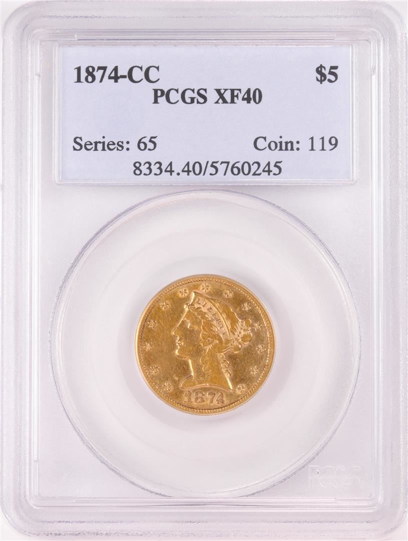 One 1874-CC $5 Liberty Half Eagle Gold Coin PCGS XF40. PCGS Graded.