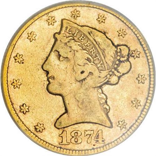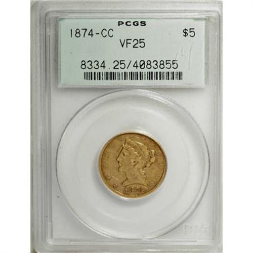 <B>1874-CC $5 VF25 PCGS.</B></I> A scarce, low mintage Carson City five dollar with only 21,198 pieces produced. This piece is well worn with even rub over the highpoints. Uncleaned, the surfaces are a pleasing light reddish-gold with deep rose accents around the margins. There are no reportable marks on either side.<BR><I>From The John Stimson, Sr. Collection, Part One.</B></I><BR><BR><B>Coin Engraver:</B> Christian Gobrecht<BR><BR><b>Shipping:</b> Coins & Currency (<a target="_blank" href="http://www.heritageauctions.com/common/shipping.php">view shipping information</a>)