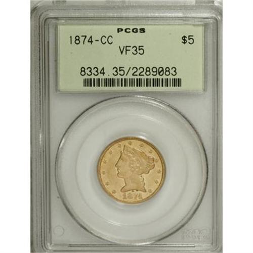 <B>1874-CC $5 VF35 PCGS.</B></I> The surfaces of this piece, housed in a green-label holder, are subdued with pale yellow color and hints of prooflike mirrors close to the devices. This issue is a relatively common one among Carson City gold of the decade.<BR><BR><b>Shipping:</b> Coins & Currency (<a target="_blank" href="http://www.heritageauctions.com/common/shipping.php">view shipping information</a>)