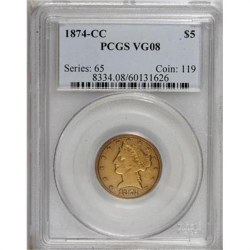 <B>1874-CC $5 VG8 PCGS.</B></I> Most of Liberty's portrait is worn, but the eye and part of the ear shows, and LIBERTY is strong. The reverse detail is much sharper. Peach-gold surfaces display wisps of lilac and green, and are quite clean for the grade.<BR><BR><B>Coin Engraver:</B> Christian Gobrecht<BR><BR><b>Shipping:</b> Coins & Currency (<a target="_blank" href="http://www.heritageauctions.com/common/shipping.php">view shipping information</a>)