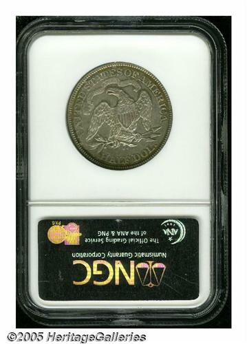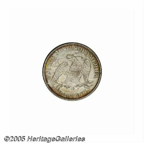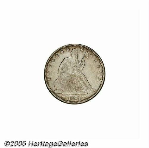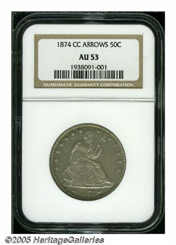 <B>1874-CC<50C> Arrows AU53 NGC.</B></I> WB-101. Second and final year of issue for the Arrows type, this design is distinguished by an obverse device that was added the previous year to signify a weight change from 192.0 to 192.9 grains. The 1874-CC is a very scarce issue in all grades and it is especially difficult in XF and better condition, rated a Low R.6 in XF/AU by Wiley-Bugert. This particular variety has a normal reverse that is characterized by a die line through ES in STATES and a tine resembling a cowlick off the eagle's head. The surfaces on this piece are lightly and evenly worn with few blemishes and red-orange mint luster near the reverse borders.