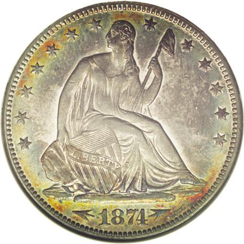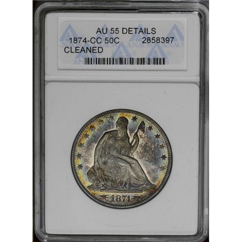 <B>1874-CC<50C> Arrows--Cleaned--ANACS. AU55 Details.</B></I> Only mildly cleaned, but the obverse toning is too good to be true. Vivid powder-blue, gold, and orange-red shades adorn the border, while the Seated Liberty is olive-green. The less colorful reverse displays medium chestnut-brown patina. A sharp example with substantial remaining luster.<BR><I>Ex: John L. Harris Collection (Stack's, 10/50), lot 542.</B></I><BR><I>From The Redfjord Collection.</B></I>