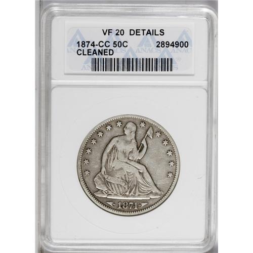 <B>1874-CC<50C> Arrows--Cleaned--ANACS. VF20 Details.</B></I> One of just 59,000 pieces minted, this moderately worn survivor has instant desirability. The dove-gray fields display telltale traces of cleaning.<BR><I>From The Catfish Creek Collection, Part Two.</B></I>