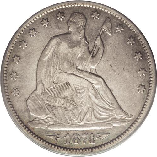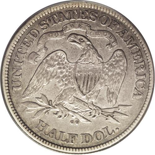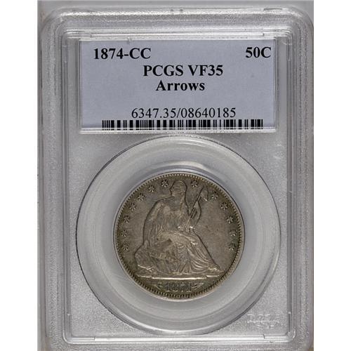 <B>1874-CC<50C> Arrows VF35 PCGS.</B></I> A moderately circulated Choice VF example with wear in a highpoint pattern. The fields are dove-gray with subdued antique gold accents, while the worn points are highlighted in pearl-gray. A nice survivor from an original mintage of only 59,000 pieces. Population: 6 in 35, 30 finer (7/06).