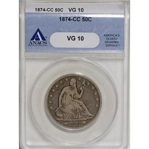 <B>1874-CC 50C Arrows VG10 ANACS.</B></I> A very pleasant example of this coveted Carson City half that avoided problems on its way to achieving 50 points of wear. This issue is in-demand, with a mintage of just 59,000 pieces, and is one of only two Carson City Arrows issues. The fields are a warm charcoal gray with tan devices. To find a more pleasing VG10 in the Seated series would prove a challenge.<BR><BR><B>Coin Engraver:</B> Christian Gobrecht<BR><BR><b>Shipping:</b> Coins & Currency (<a target="_blank" href="http://www.heritageauctions.com/common/shipping.php">view shipping information</a>)