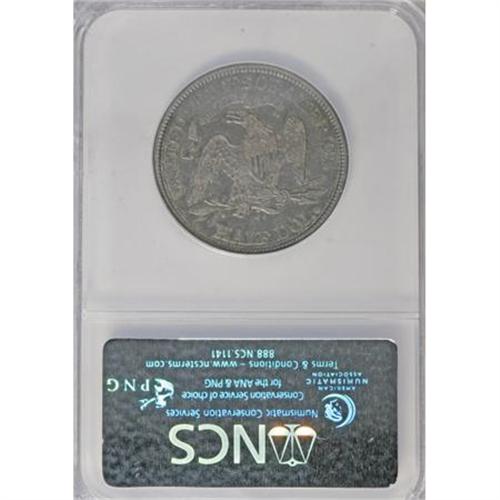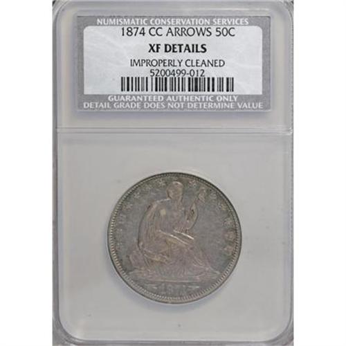 <B>1874-CC 50C Arrows--Improperly Cleaned--NCS. XF Details.</B></I> The second (and final) Arrows Carson City half has a low mintage and is seldom seen at the XF level. Deep olive-brown, dove-gray, and forest-green envelop this lightly circulated and collectible example. Inoffensively cleaned, but void of mentionable abrasions.<BR><I>From The Yoder Family Collection, Part One.</B></I><BR><BR><B>Coin Engraver:</B> Christian Gobrecht<BR><BR><b>Shipping:</b> Coins & Currency (<a target="_blank" href="http://www.heritageauctions.com/common/shipping.php">view shipping information</a>)