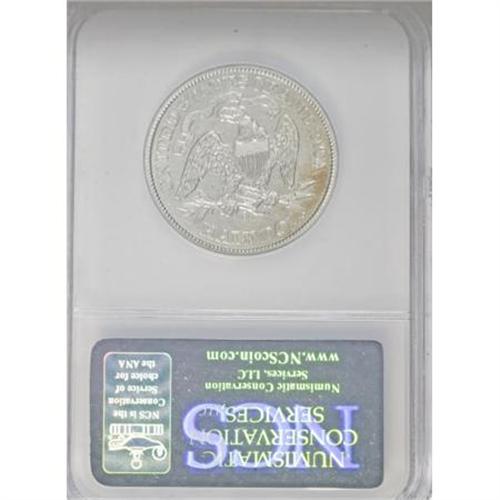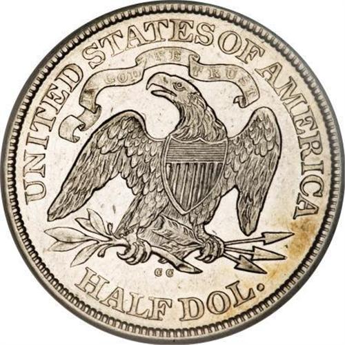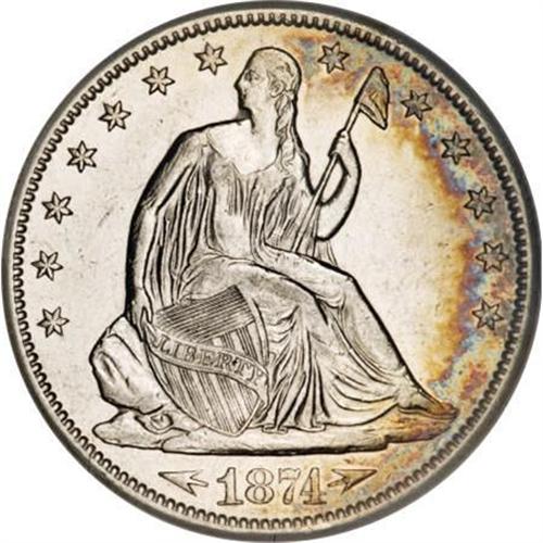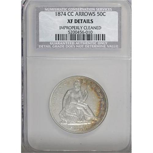 <B>1874-CC 50C Arrows--Improperly Cleaned--NCS. XF Details.</B></I> Somewhat bright from a cleaning, but the right borders have since acquired golden-brown, electric-blue, and ruby-red toning. The devices exude luster, and field abrasions are minor. The rarer of the two Carson City Arrows issues. A mere 59,000 pieces were struck.<BR><BR><B>Coin Engraver:</B> Christian Gobrecht<BR><BR><b>Shipping:</b> Coins & Currency (<a target="_blank" href="http://www.heritageauctions.com/common/shipping.php">view shipping information</a>)