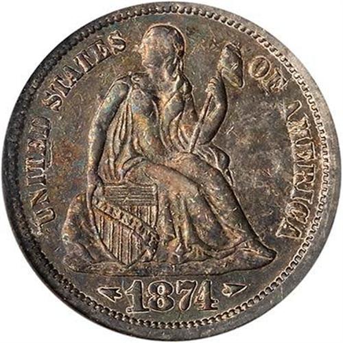 The 1874-CC dime is one of what many numismatists call the "big four" of the series, all of which, it shouldn't surprise, were produced in Carson City -- 1871-CC, 1872-CC, 1873-CC Arrows, and the present date, 1874-CC Arrows. The 1874-CC dime is far and away the rarest among the business strike Liberty Seated dimes. (Some 12,400 1873-CC dimes without arrows at date were struck, but virtually the entire mintage was melted at the time of the design change to the arrows format; just one specimen is currently known of the variety and it is not considered a "regular" issue by serious students of the series.)