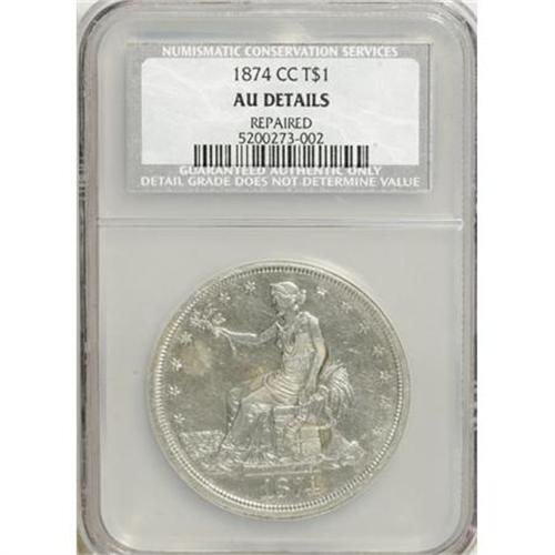 <B>1874-CC T$1 --Repaired--NCS. AU Details.</B></I> NGC Census: (0/0). PCGS Population (0/0). Mintage: 1,373,200. (#7035)<BR><BR><B>Coin Engraver:</B> William Barber<BR><BR><b>Shipping:</b> Coins & Currency (<a target="_blank" href="http://www.heritageauctions.com/common/shipping.php">view shipping information</a>)