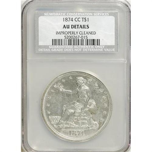 <B>1874-CC T$1 --Improperly Cleaned--NCS. AU Details.</B></I> NGC Census: (0/0). PCGS Population (0/0). Mintage: 1,373,200. (#7035)<BR><BR><B>Coin Engraver:</B> William Barber<BR><BR><b>Shipping:</b> Coins & Currency (<a target="_blank" href="http://www.heritageauctions.com/common/shipping.php">view shipping information</a>)