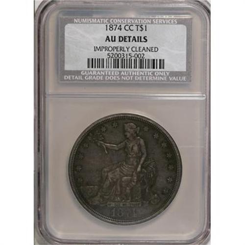 <B>1874-CC T$1 --Improperly Cleaned--NCS .AU Details.</B></I> NGC Census: (0/0). PCGS Population (0/0). Mintage: 1,373,200. (#7035)<BR><BR><B>Coin Engraver:</B> William Barber<BR><BR><b>Shipping:</b> Coins & Currency (<a target="_blank" href="http://www.heritageauctions.com/common/shipping.php">view shipping information</a>)