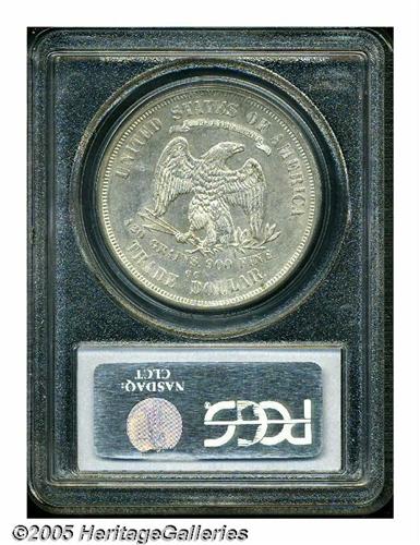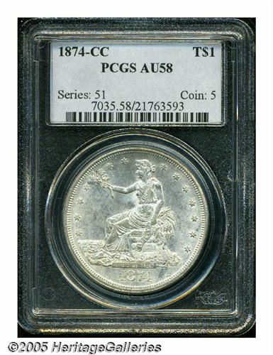 <B>1874-CC<T$1> AU58 PCGS.</B></I> Only the barest trace of wear and the most superficial of scattered abrasions give evidence that this coin was ever circulated, albeit for a brief period of time indeed. Untoned and frosty, with lovely details and a few faint hairlines appearing on each side, this is a truly attractive Trade Dollar.