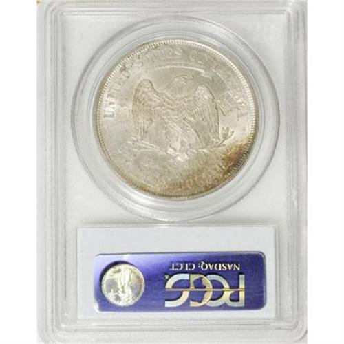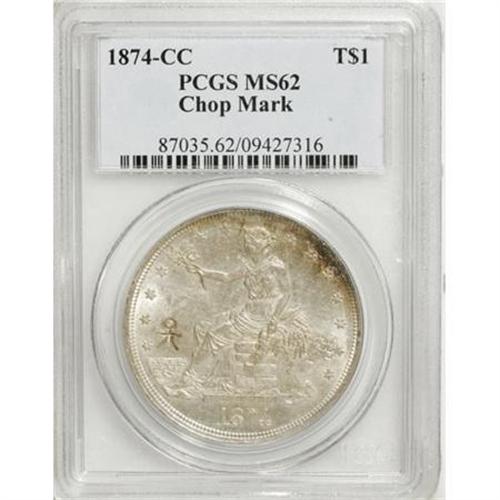 <B>1874-CC T$1 Chop Mark MS62 PCGS.</B></I> A chop mark that resembles a stick figure is on the field near the knees, and a second (and more ornate) chop is seen on the reverse near 3 o'clock. A lustrous and nicely struck Carson City Trade dollar with peripheral golden-brown and aqua-blue toning.<BR><BR><b>Shipping:</b> Coins & Currency (<a target="_blank" href="http://www.heritageauctions.com/common/shipping.php">view shipping information</a>)