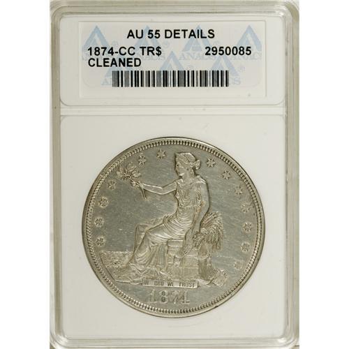 <B>1874-CC T$1 --Cleaned--ANACS. AU55 Details.</B></I> NGC Census: (14/143). PCGS Population (35/142). Mintage: 1,373,200. Numismedia Wsl. Price: $450. (#7035)<BR><BR><b>Shipping:</b> Coins & Currency (<a target="_blank" href="http://www.heritageauctions.com/common/shipping.php">view shipping information</a>)