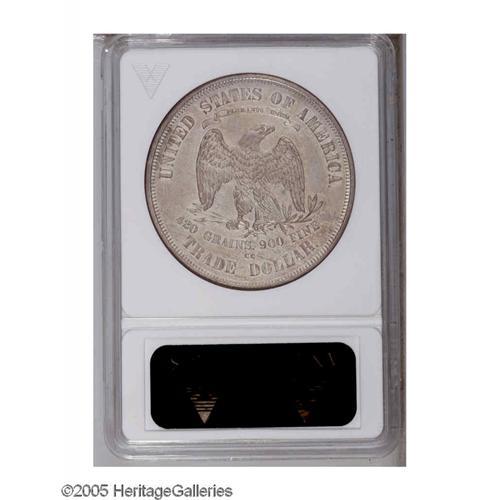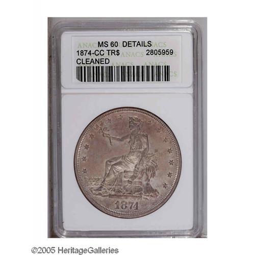 <B>1874-CC<T$1>--Cleaned--ANACS. MS60 Details.</B></I> Small CC mintmark. A well struck and lightly hairlined piece, attractively toned in gold and sky-blue colors. Carson City Trade Dollars are not as popular as their Morgan Dollar counterparts, but they are certainly scarcer in Mint State.
