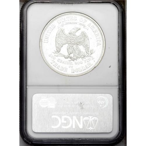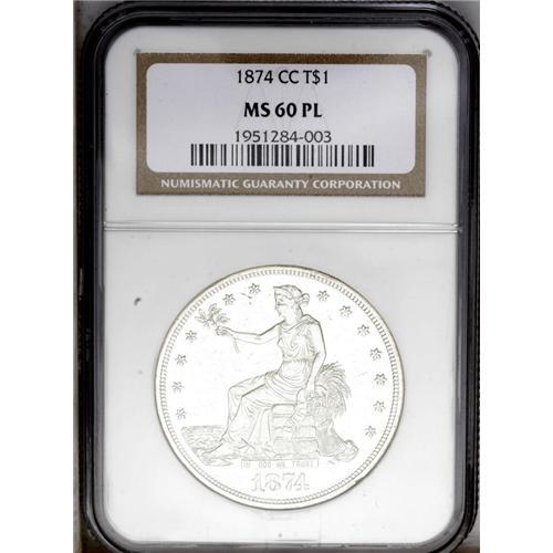 <B>1874-CC<T$1> MS60 Prooflike NGC.</B></I> The sole example of this issue in any grade to which NGC has given the Prooflike designation (3/06). This Carson City Trade dollar shows pleasing depth of reflectivity in the obverse and reverse fields and light frost on the devices. As one would expect from the grade, numerous contact marks adorn the surfaces, but are limited in effect by the attractiveness of the mirrors. <BR><BR><B>Important notice:</B> Heritage usually auctions material at the rate of 200-250 lots per hour. On some occasions eBay Live bid software or the Internet may not be able to keep up with the pace of the auction. We recommend placing a realistic absentee bid now as insurance to avoid disappointment. Occasionally the auctioneer may eliminate or reject an eBay Live bid, and the auctioneer may also reopen a lot after the close of the eBay live bidding (usually because we missed an audience bid), and may reject your bid even if it shows you as the winning bidder. By bidding via eBay Live, you agree that Heritage may award the lot to another bidder at its sole discretion under the circumstances described above or any other reasonable circumstances. Since eBay bids are not shown to us until we open the lot on the floor, we treat those bids just like floor bids. In most cases the floor responds before the eBay bid is presented to us, due to Internet lag time, so for consistency we have made it a policy that floor bids are always considered first over tie eBay live bids. Also please note that all Heritage lots purchased through eBay Live carry a 20% Buyer's Premium. Please make sure you read the Terms and Conditions before you bid. This lot is being auctioned in conjunction with a live floor auction by Heritage Galleries & Auctioneers. All final auction and invoice information will be supplied by Heritage Galleries & Auctioneers, and all other information should be considered preliminary. Lot:2217 <BR><BR><B>Winning Notification and Billing:</B> After the FINAL session in this auction is complete, Heritage will send e-mail and snail mail invoices. This process normally takes several days. All final auction and invoice information will be supplied by Heritage Galleries & Auctioneers, and all other information should be considered preliminary. <BR><BR>This auction will be conducted on a live auction floor and over the Internet through eBay Live. If you choose to place an absentee bid, please take a moment to <font color='#0000ff'><u><a href='http://pages.ebay.com/liveauctions/help/before/laabsentee.html'>learn how eBay Live absentee bidding works</a></u></font><font color='#000000'>