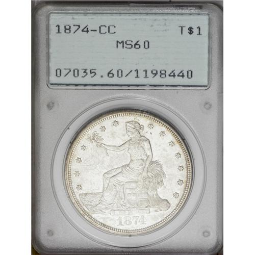 <B>1874-CC<T$1> MS60 PCGS.</B></I> In a first-generation PCGS holder, and exceptionally pleasing for the grade. Both sides have reflective, lightly mirrored fields with a hint of contrast. Faint splashes of pale gold toning add to the eye appeal.