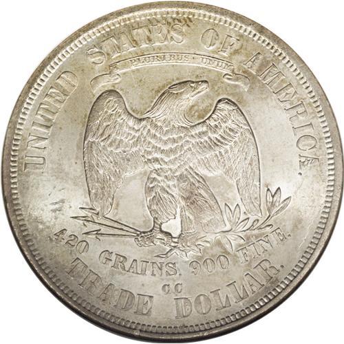 <B>1874-CC<T$1> MS62 ANACS.</B></I> Most of the 1,373,200 mintage went to China, where it was extensively chopmarked. David Bowers (1993) writes: "The 1874-CC is the most plentiful Carson City Mint chopmarked trade dollar, and fourth most common of <I>all</B></I> chopmarked trade dollars." The silver-gray surfaces of this specimen emit soft luster, and are visited by occasional whispers of olive-green toning, especially on the reverse. The design elements exhibit a better-than-average strike for the issue. A few small contact marks are seen on Liberty's cheek and scattered over the fields of both sides, and an unobtrusive pinscratch is visible from the back of Liberty's head to the rim. Some fine die cracks are noted on each side.